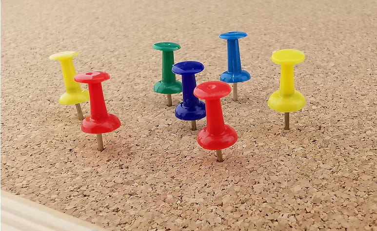 - Powierzchnia z korka naturalnego – sprawia, że po jakimś czasie otwory po wyjętej pinezce zasklepiają się.