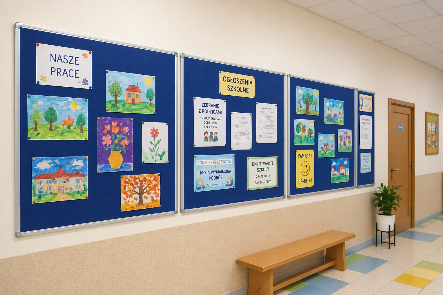 Powierzchnia wykonana z wysokiej jakości materiału tekstylnego w kolorze niebieskim umożliwia wygodne korzystanie z pinezek, zapewniając trwałość i estetyczny wygląd przez długi czas. Szeroka gama dostępnych kolorów pozwala dopasować tablicę do wystroju wnętrza – na specjalne zamówienie dostępne są również inne warianty kolorystyczne.